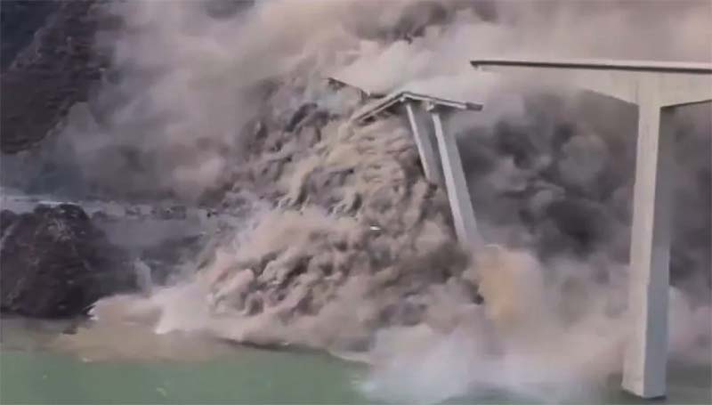 parte da ponte e a estrada. O colapso levantou uma enorme nuvem de poeira,